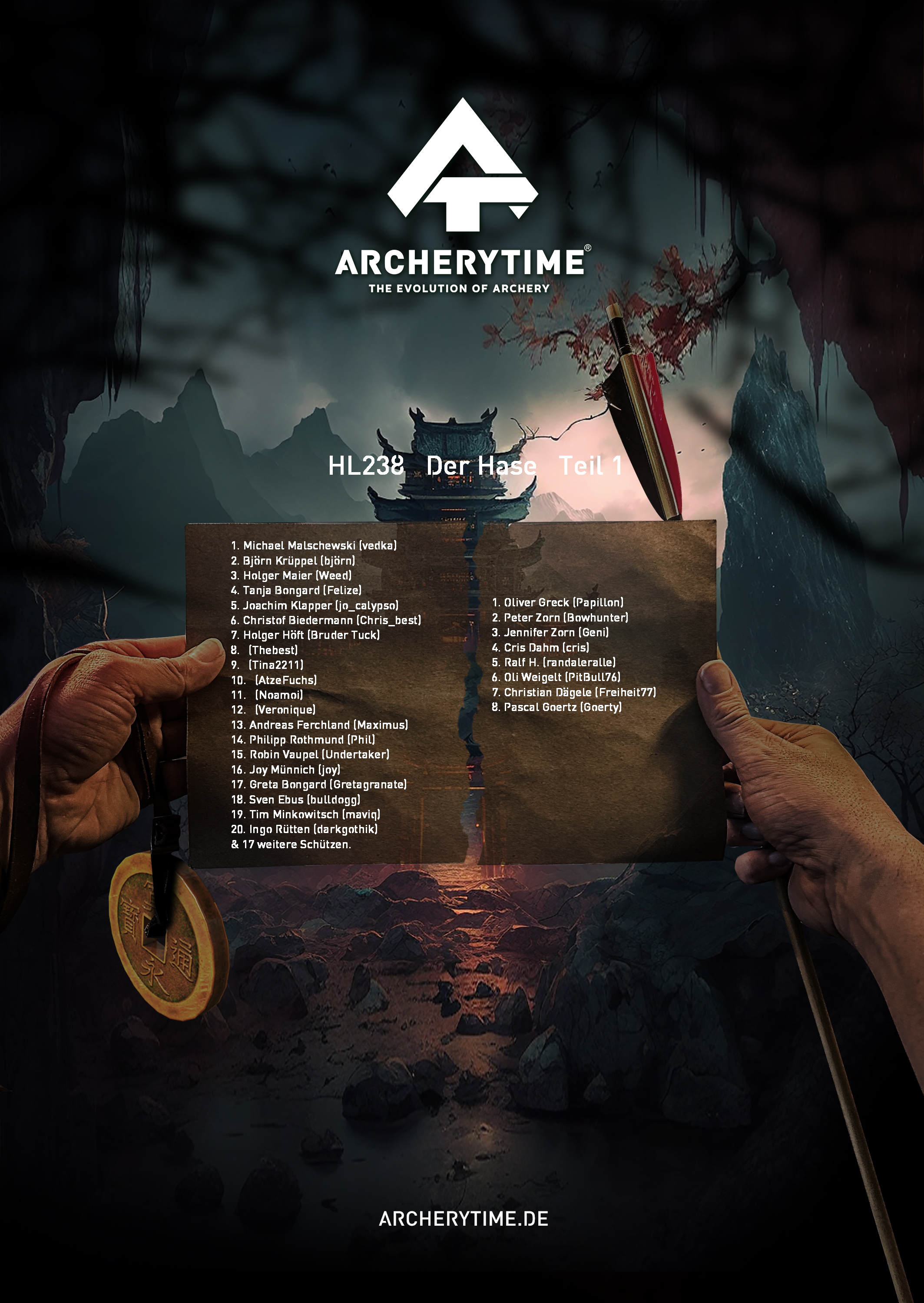 Gleich einem alten Artefakt aus vergangenen Tagen, zeigt das Poster in monumentaler Schönheit die 20 besten Bogenschützen, die je das Legend Turnier bestanden haben. In steinernen Schriftzügen sind ihre Namen und Siege verewigt und erzählen von unvorstellbaren Kämpfen und unglaublichen Leistungen.
