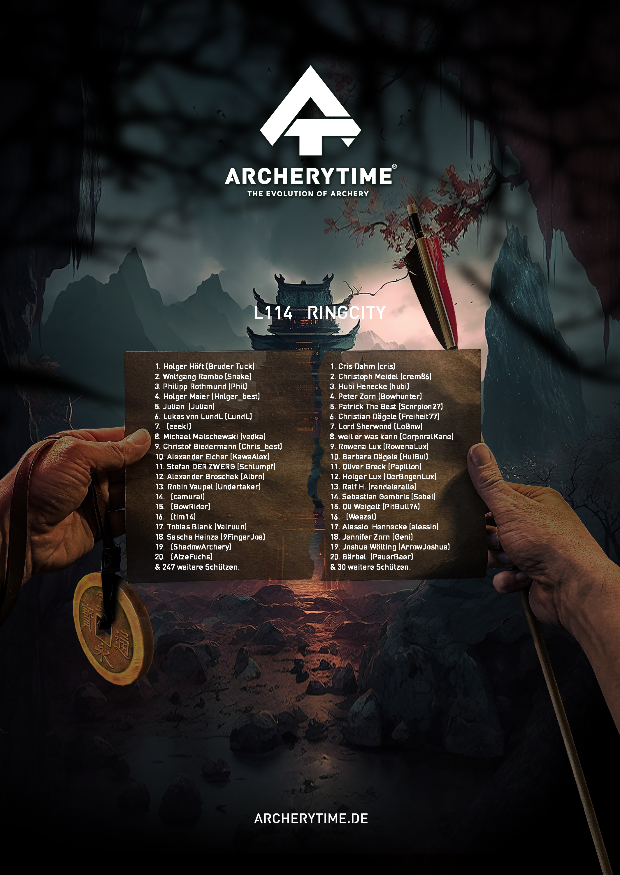 Gleich einem alten Artefakt aus vergangenen Tagen, zeigt das Poster in monumentaler Schönheit die 20 besten Bogenschützen, die je das Legend Turnier bestanden haben. In steinernen Schriftzügen sind ihre Namen und Siege verewigt und erzählen von unvorstellbaren Kämpfen und unglaublichen Leistungen.