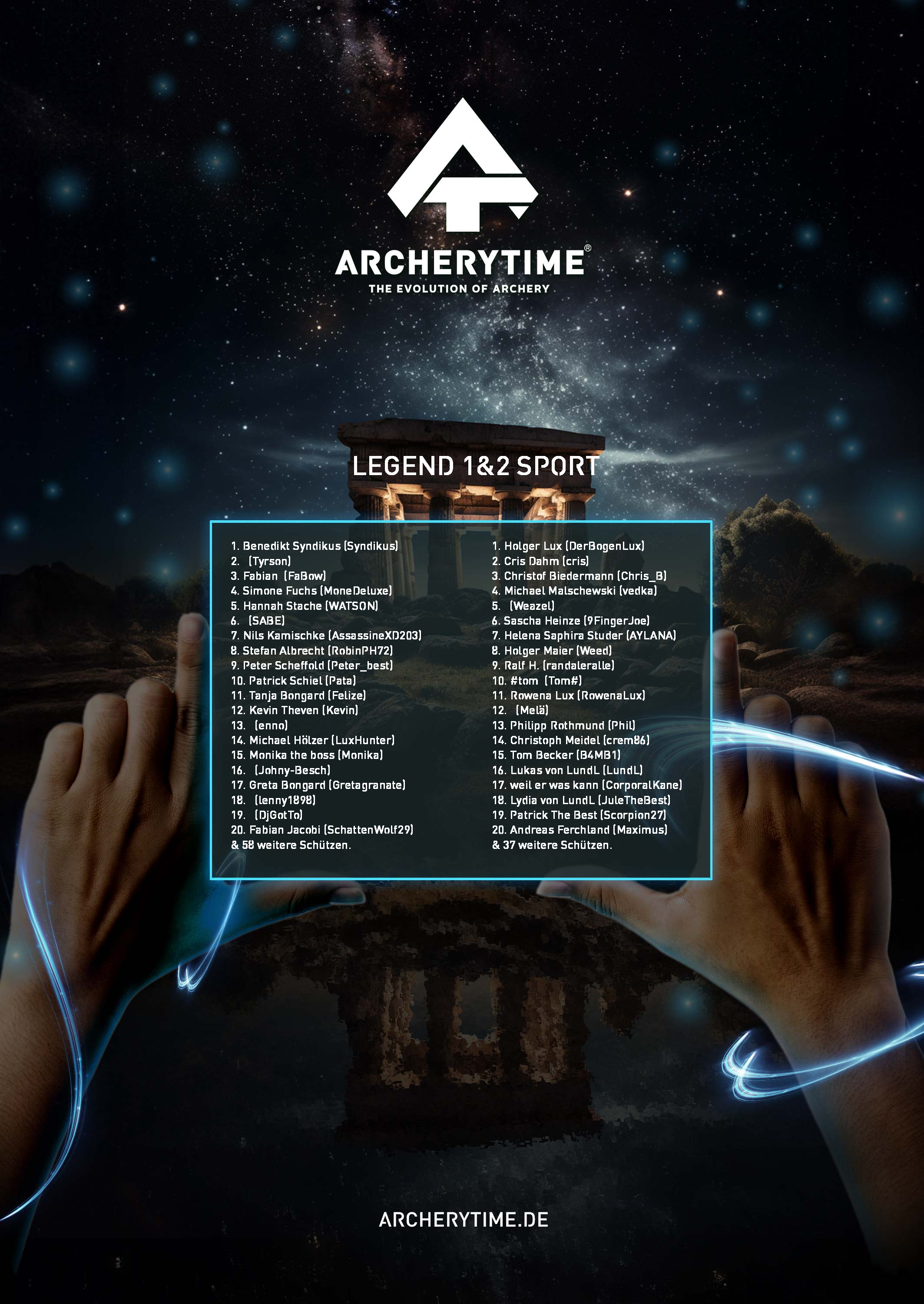 Gleich einem alten Artefakt aus vergangenen Tagen, zeigt das Poster in monumentaler Schönheit die 20 besten Bogenschützen, die je das Legend Turnier bestanden haben. In steinernen Schriftzügen sind ihre Namen und Siege verewigt und erzählen von unvorstellbaren Kämpfen und unglaublichen Leistungen.