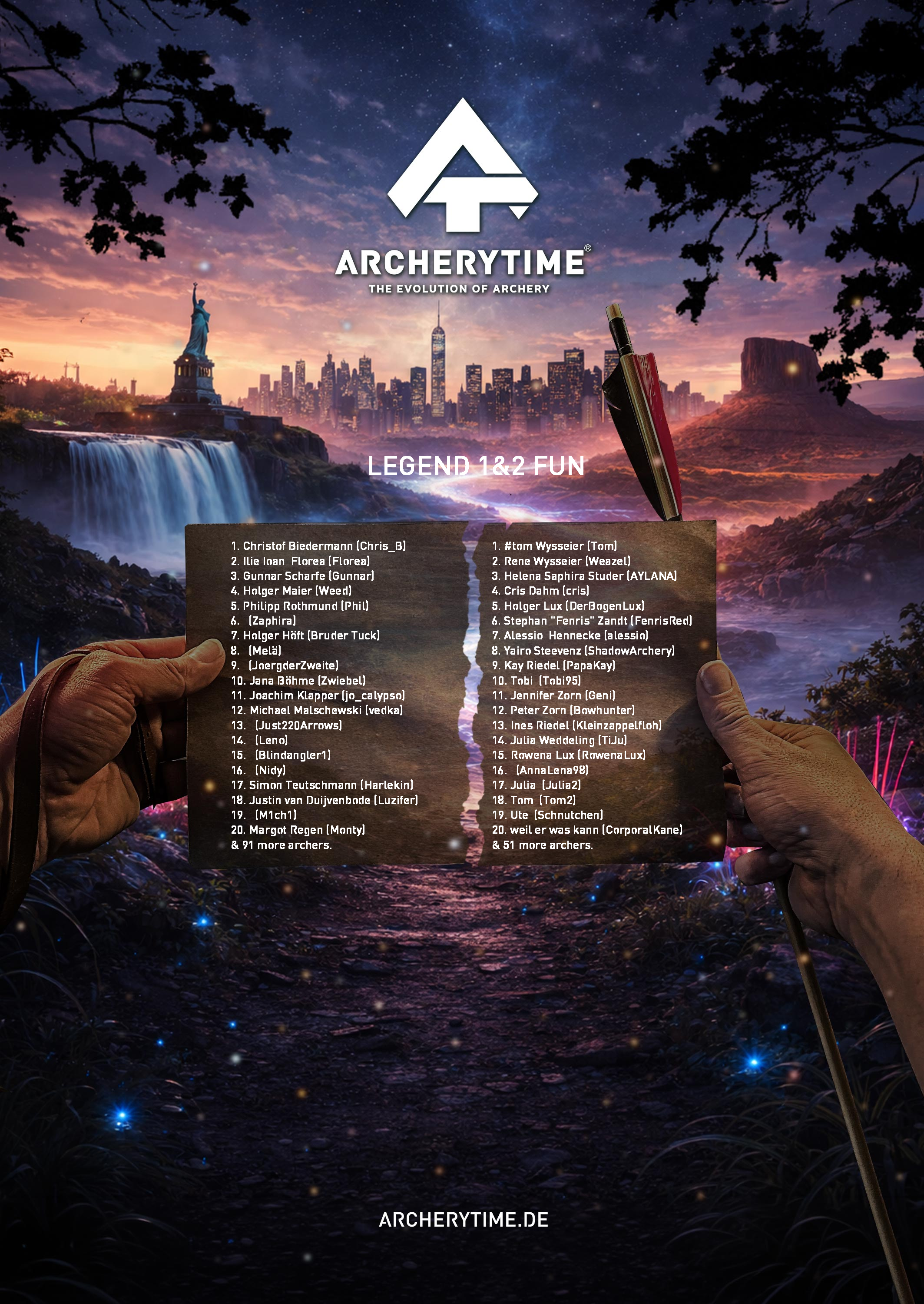 This poster showcases the top 20 archers who conquered the Legend tournament. Their names and scores are immortalized in stone – a tribute to skill, dedication and the spirit of archery.