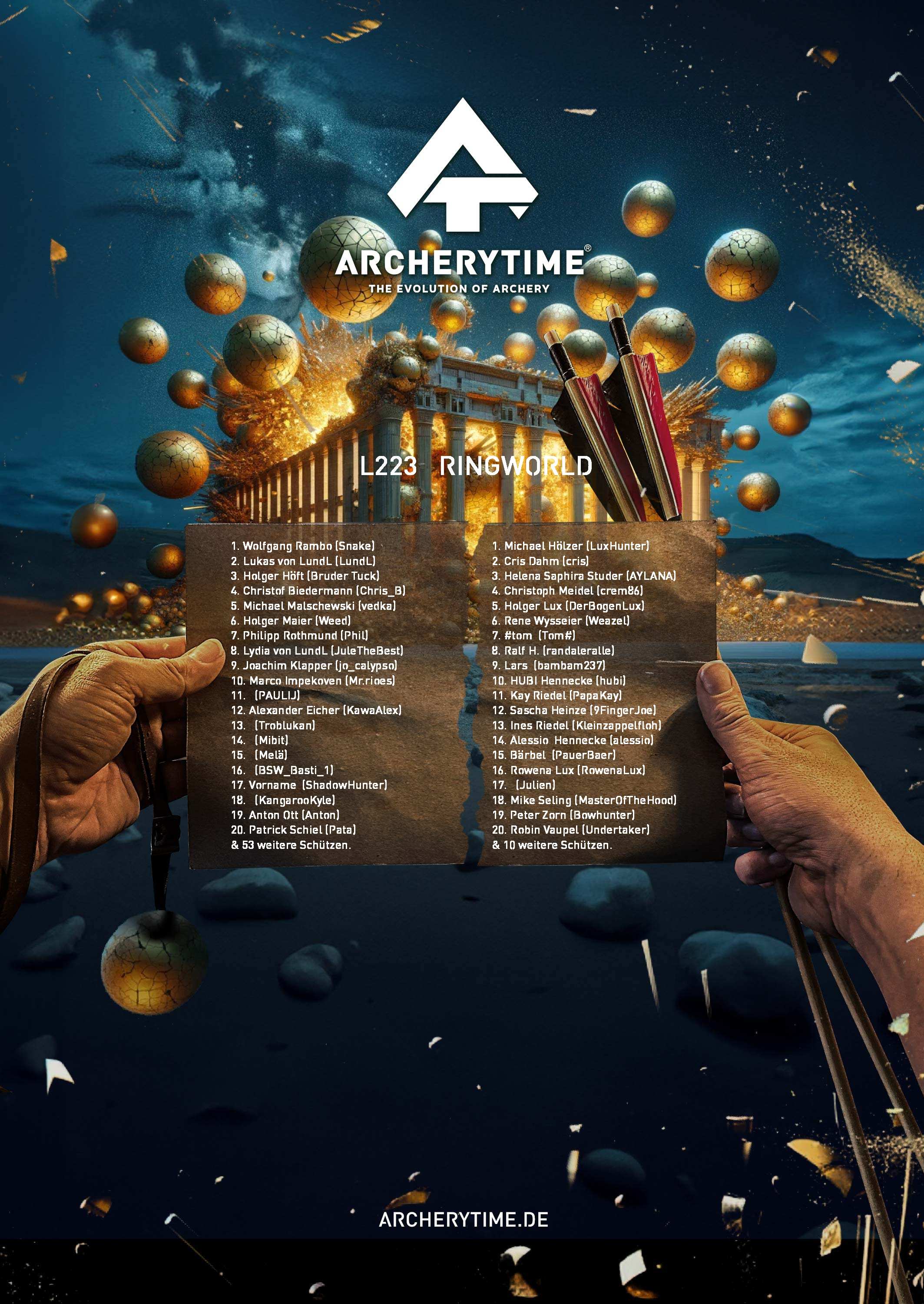 Gleich einem alten Artefakt aus vergangenen Tagen, zeigt das Poster in monumentaler Schönheit die 20 besten Bogenschützen, die je das Legend Turnier bestanden haben. In steinernen Schriftzügen sind ihre Namen und Siege verewigt und erzählen von unvorstellbaren Kämpfen und unglaublichen Leistungen.